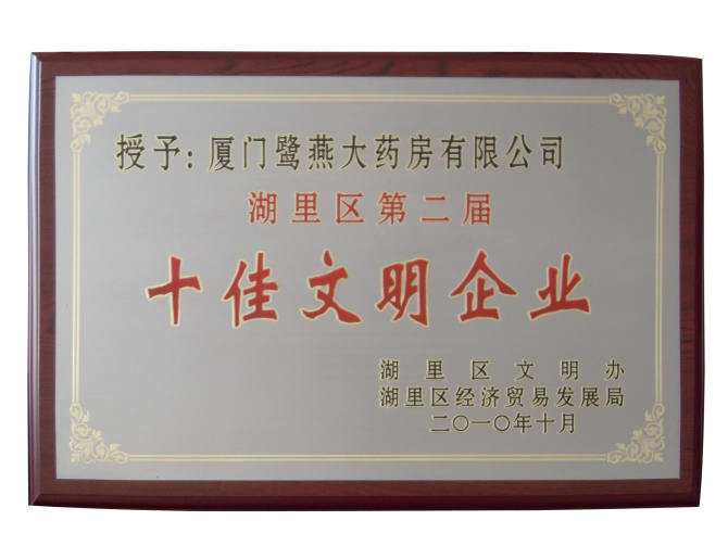 廈門(mén)鷺燕大藥房有限公司于2010年10月被廈門(mén)市湖里區(qū)文明辦、廈門(mén)市湖里區(qū)經(jīng)濟(jì)貿(mào)易發(fā)展局評(píng)為湖里區(qū)第二屆“十佳文明企業(yè)“榮譽(yù)稱(chēng)號(hào)。